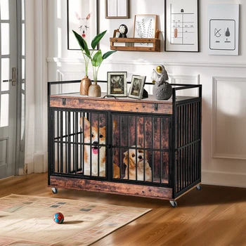 37.5 Inch Furniture Dog Crate with Wheels Pet Puppy Indoor Wooden Kennel with Removable Tray